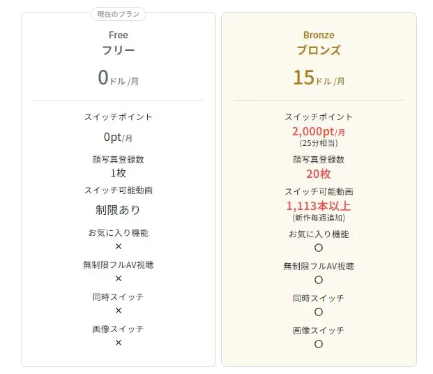 無料で使える「フリー」と、月額15ドルの「ブロンズ」の2つのみ。